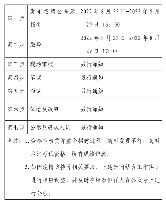 ?2022年8月23日-2022年8月29日 16:00在錦泰恒祥人資官網(wǎng)(www.jthxhr.com)、“錦泰恒祥人資”微信公眾號、“國控集團(tuán)”官方網(wǎng)站(m.mychaos.com.cn)及上級部門要求的相關(guān)網(wǎng)站等發(fā)布招聘公告。