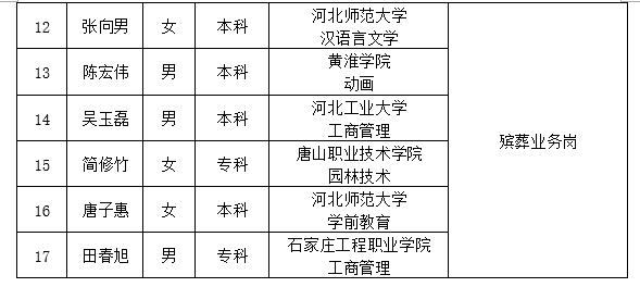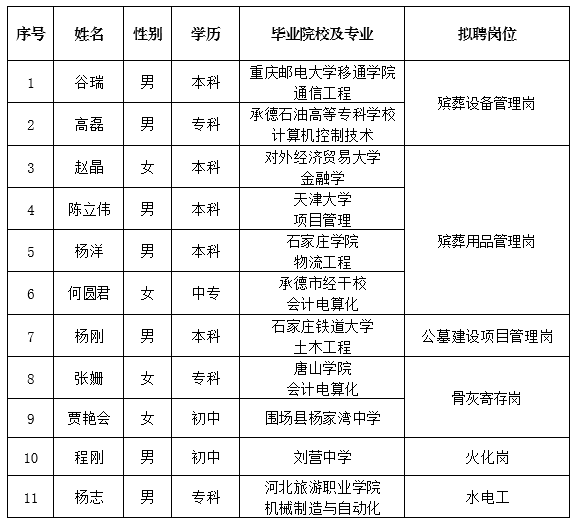 因公司發(fā)展需要,承德市國瑞置業(yè)有限公司委托第三方機(jī)構(gòu)面向社會公開招聘殯儀館運(yùn)營各崗位人員17名。現(xiàn)對擬錄用人員信息進(jìn)行公示,公示期間如有異議,可通過電話、信函等方式反映,反映意見請署真實(shí)姓名。