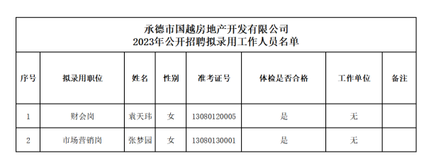 根據(jù)2023年度承德市國越房地產(chǎn)開發(fā)有限公司公開招聘工作人員的相關(guān)要求,經(jīng)過筆試、面試、體檢和考察等程序,確定袁天瑋、張夢園2名同志為承德市國越房地產(chǎn)開發(fā)有限公司擬錄用工作人員,現(xiàn)予以公示。公示期間如有異議,可通過電話、信函等方式反映,反映意見請署真實(shí)姓名。